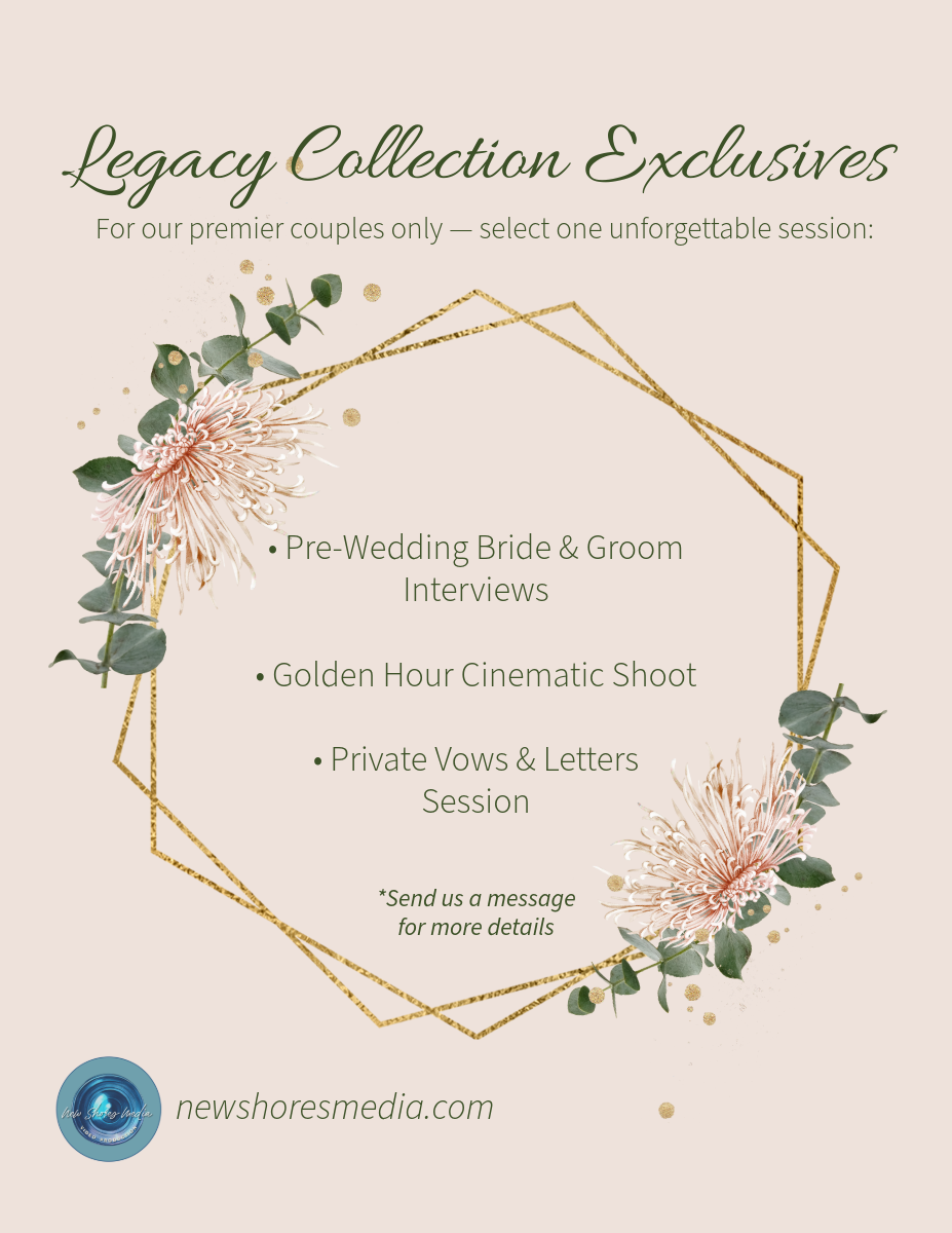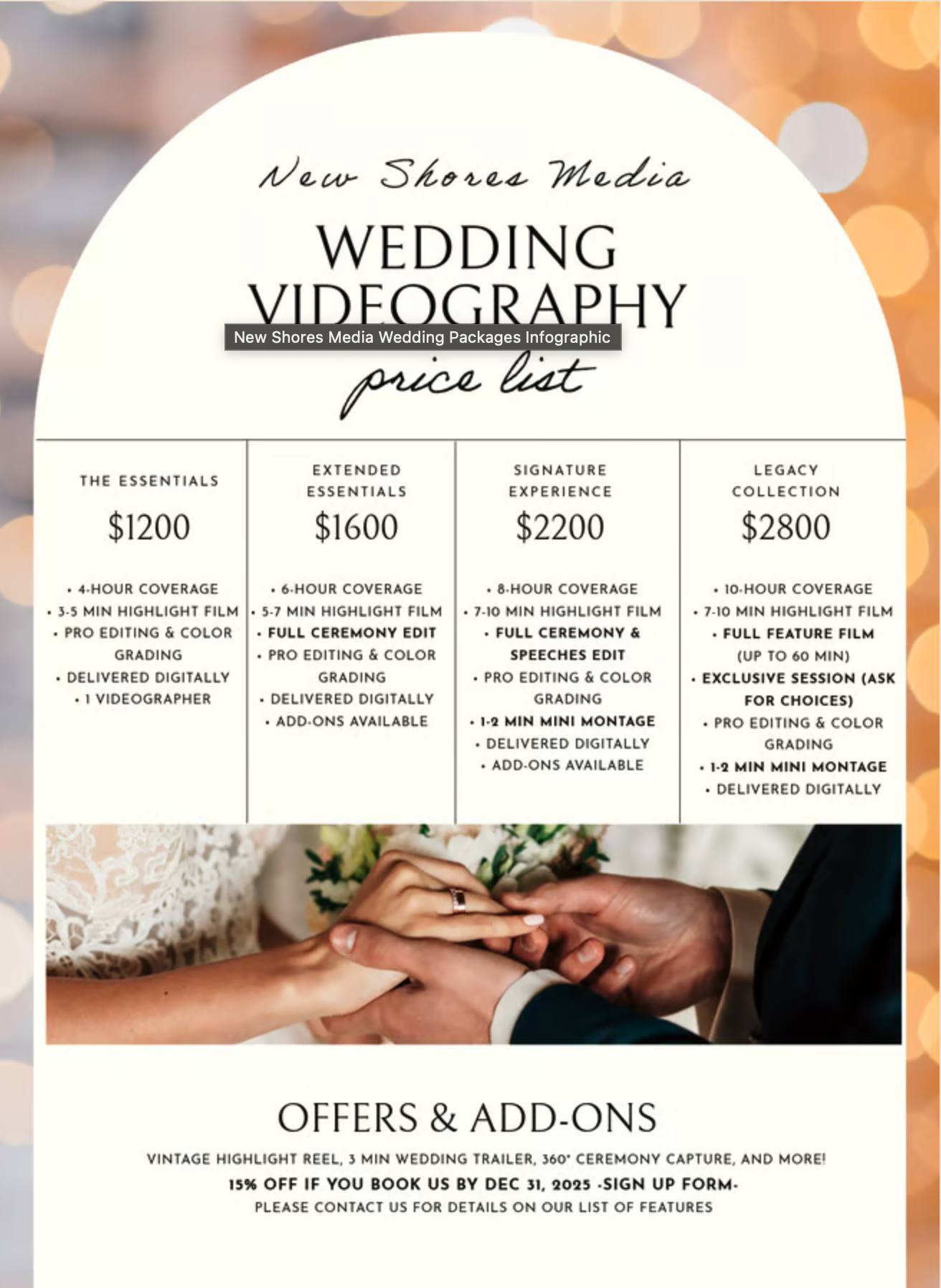 At New Shores Media, we offer tailored videography packages to fit every couple's vision and budget. Contact us down below for more information.