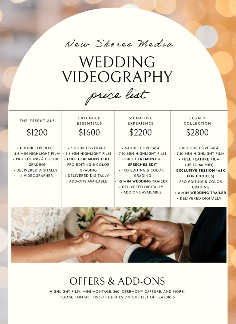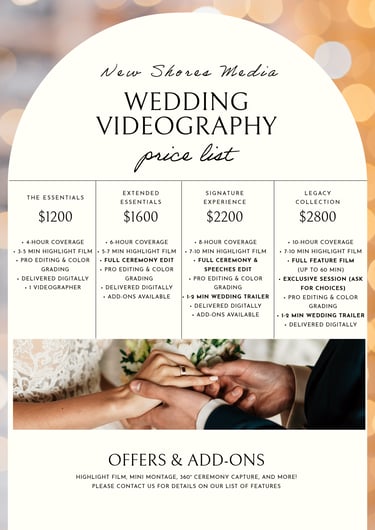 At New Shores Media, we offer flexible packages to have the film you'll love without stretching your budget.